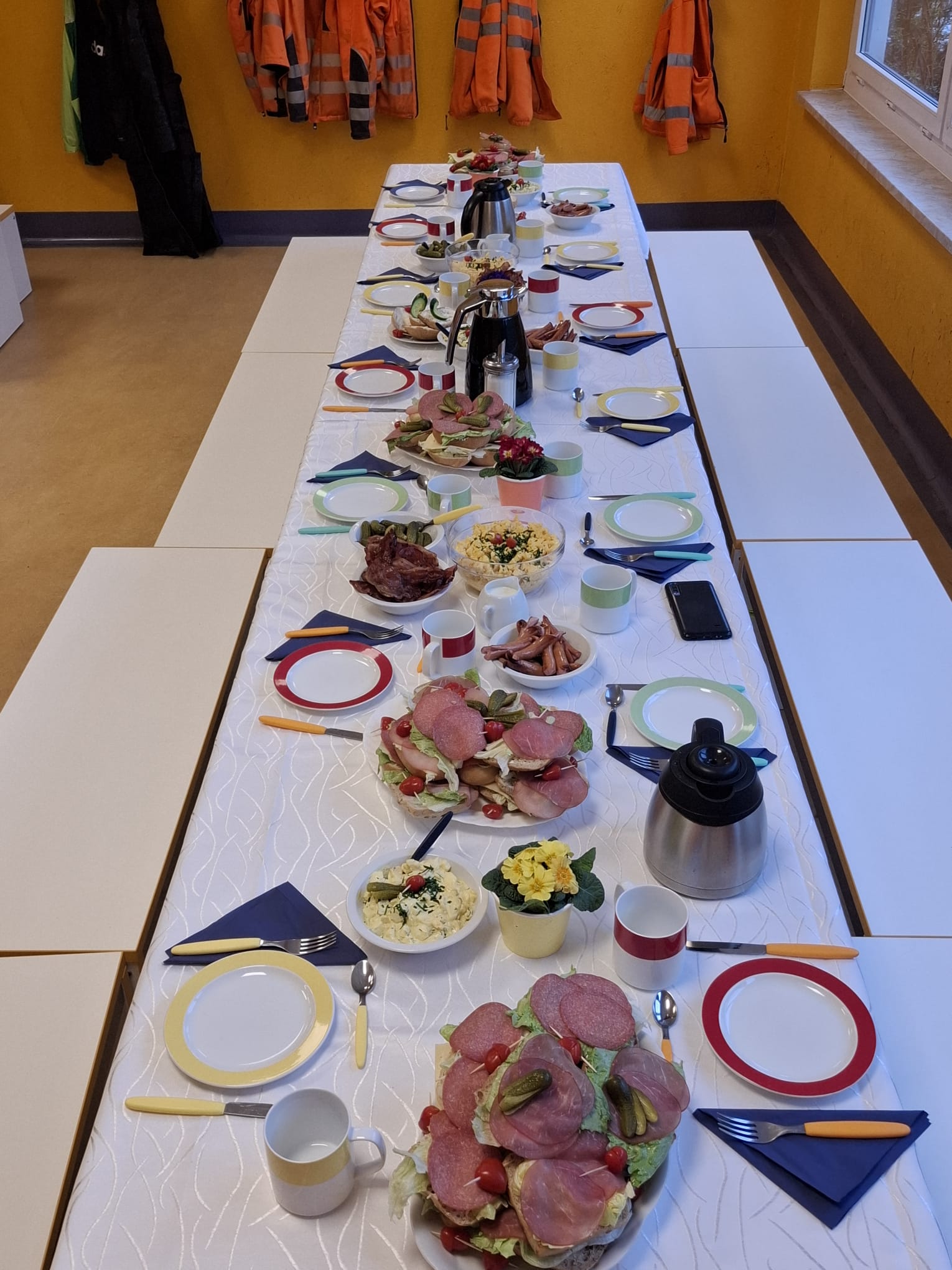 Mit viel Engagement und Sorgfalt wurde der Frühstückstisch gedeckt und liebevoll angerichtet. Die Auswahl reichte von frischen Brötchen über Eiersalat und Rührei mit Speck bis hin zu heißen Getränken – alles, was man für einen guten Start in den Tag braucht.