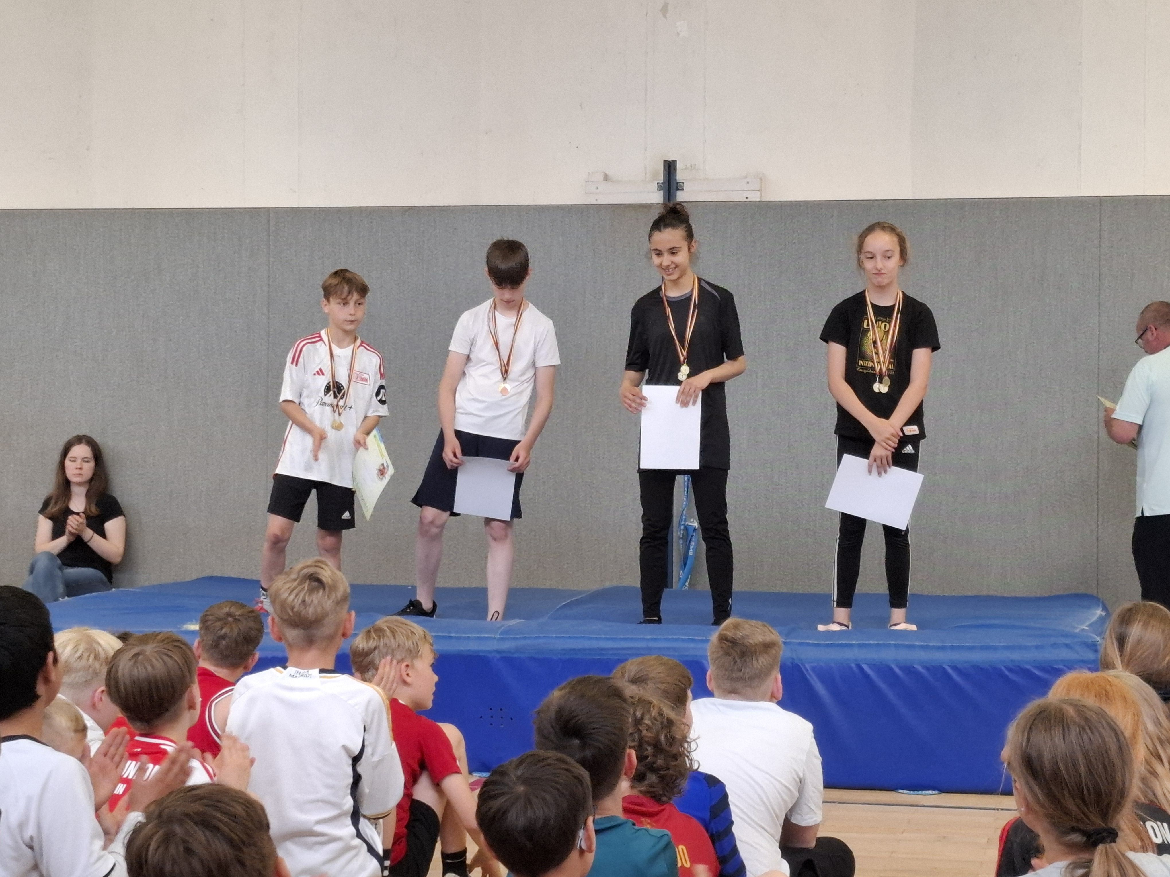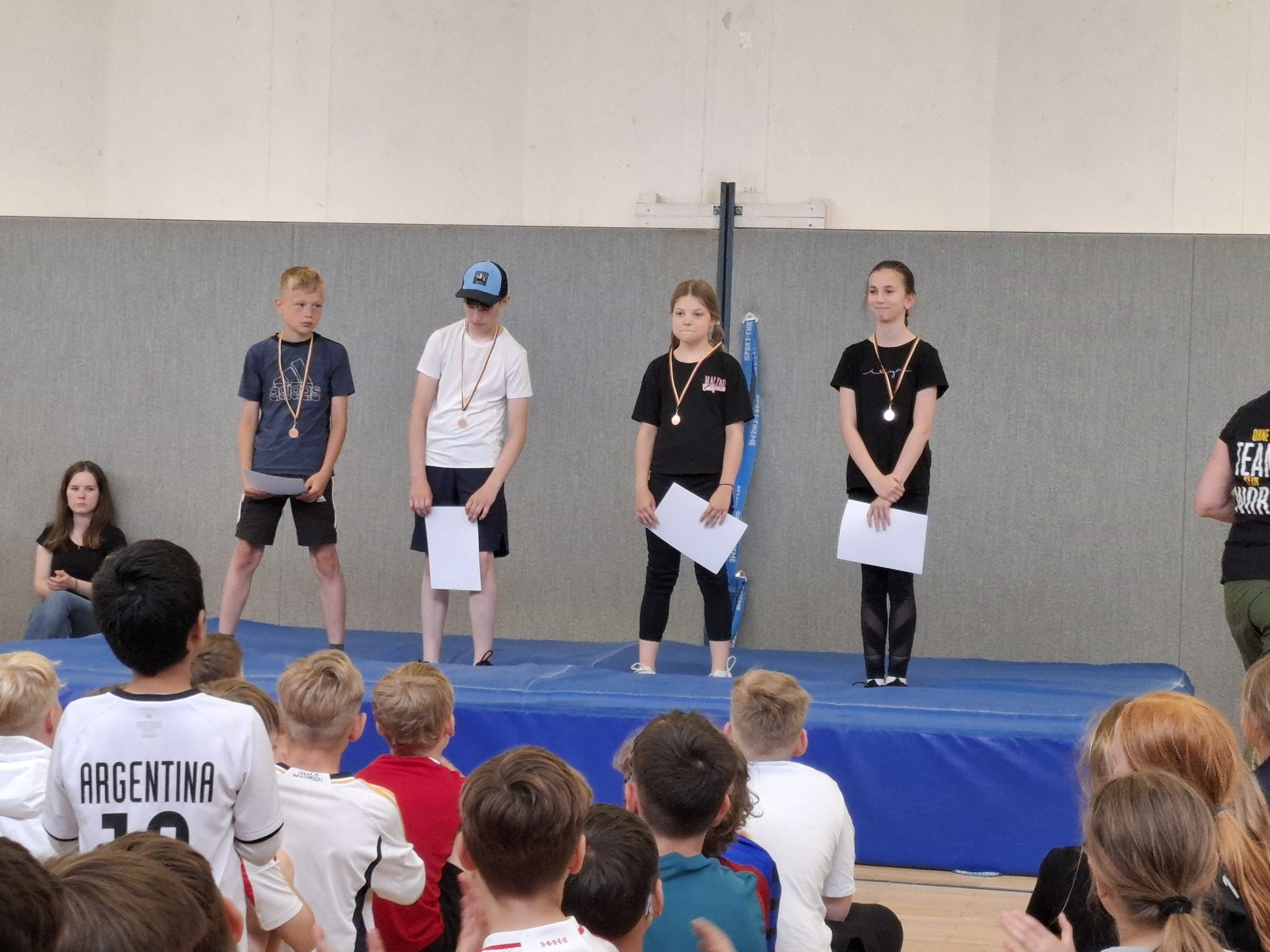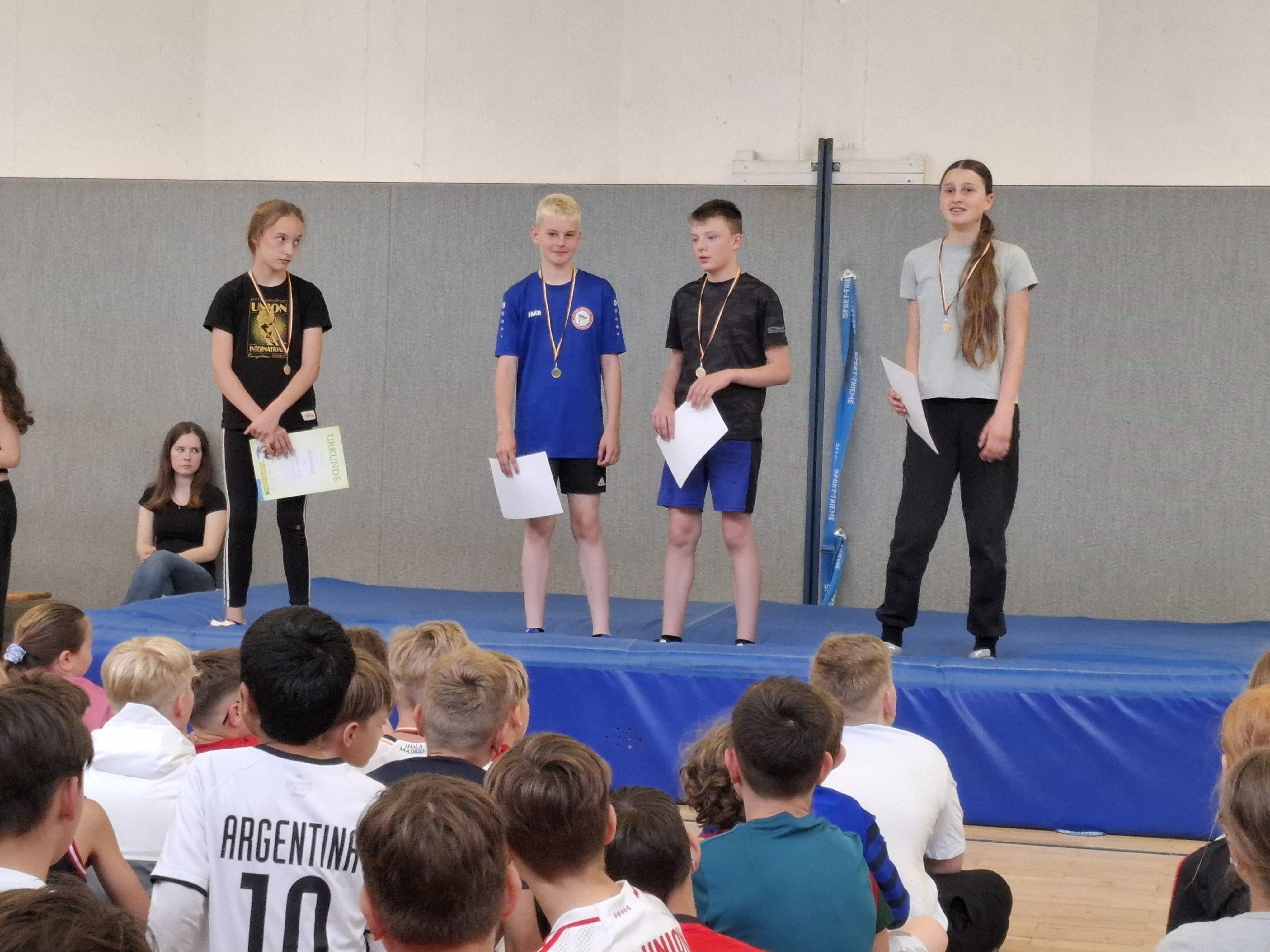 Ein besonderer Dank gilt der 6. Klasse, die gemeinsam mit Herrn Schmidt alles so vorbildlich vorbereitet hat. Von der Planung über die Einweisung bis hin zur Zuteilung der Helfer*innen – die Organisation war perfekt durchdacht. Die Medaillen hingen schon bereit, jede Klasse wurde von einem ehemaligen Schüler oder einer ehemaligen Schülerin zur Erwärmung begleitet und alle Stationen waren startklar.