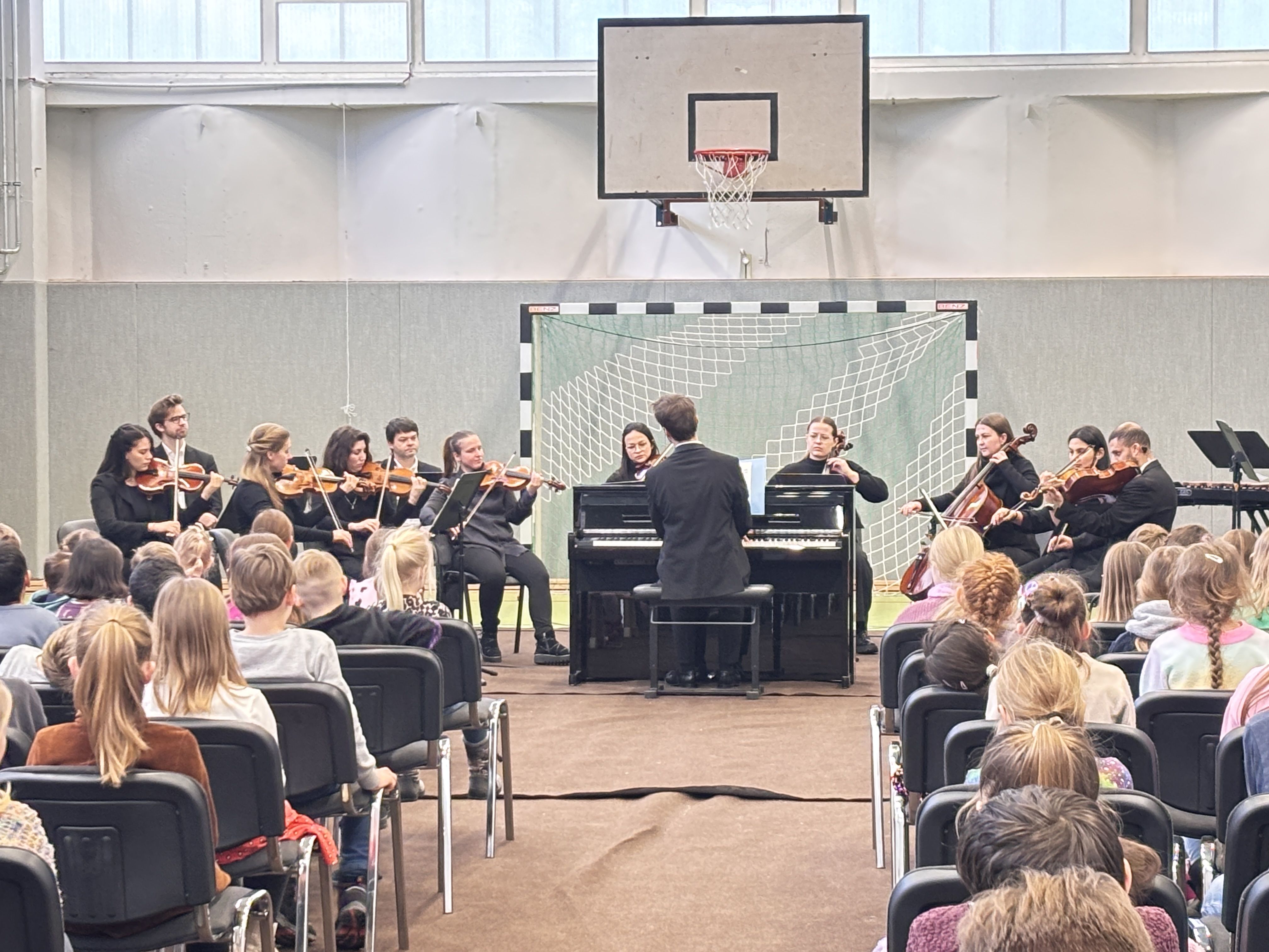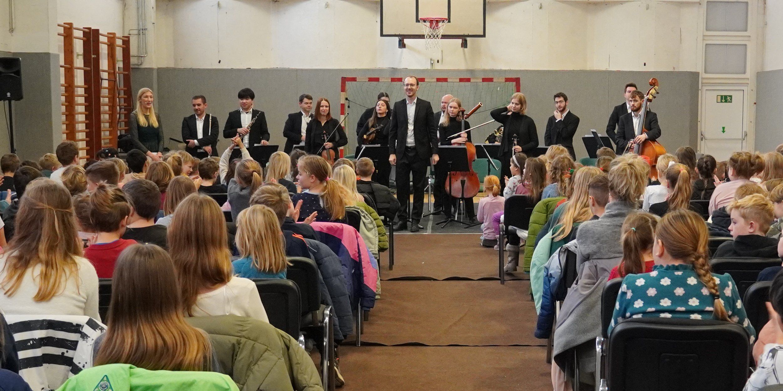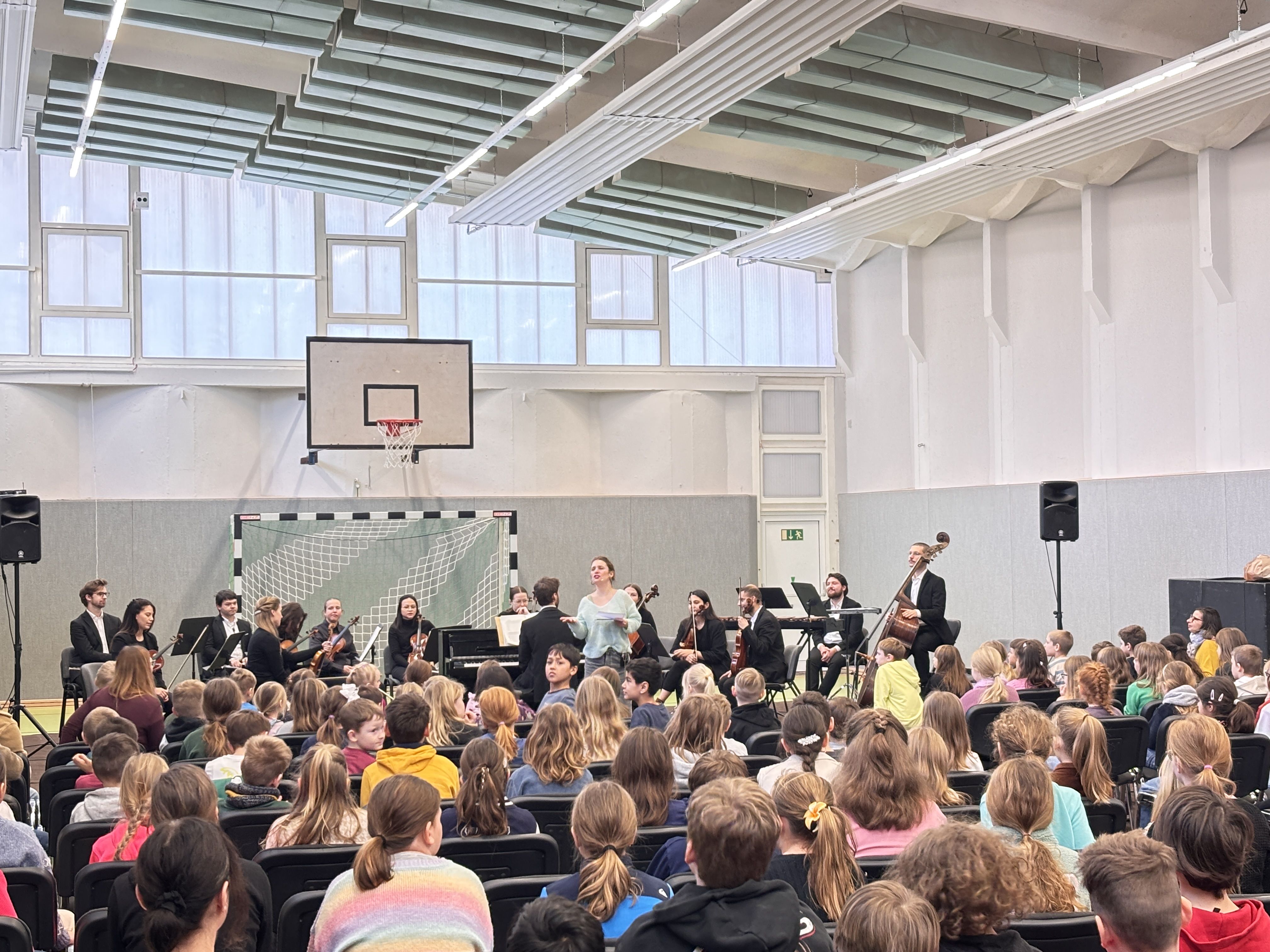 „Der Karneval der Tiere“ war ein voller Erfolg. Die Aufführung begeisterte alle Kinder ebenso wie die anwesenden Erwachsenen. Mit großer Aufmerksamkeit, sichtbarer Freude und beeindruckender Konzentration verfolgten die Schülerinnen und Schüler das musikalische Geschehen. Die Atmosphäre in der Turnhalle war ruhig und wertschätzend – alle Kinder benahmen sich vorbildlich und hörten aufmerksam zu.