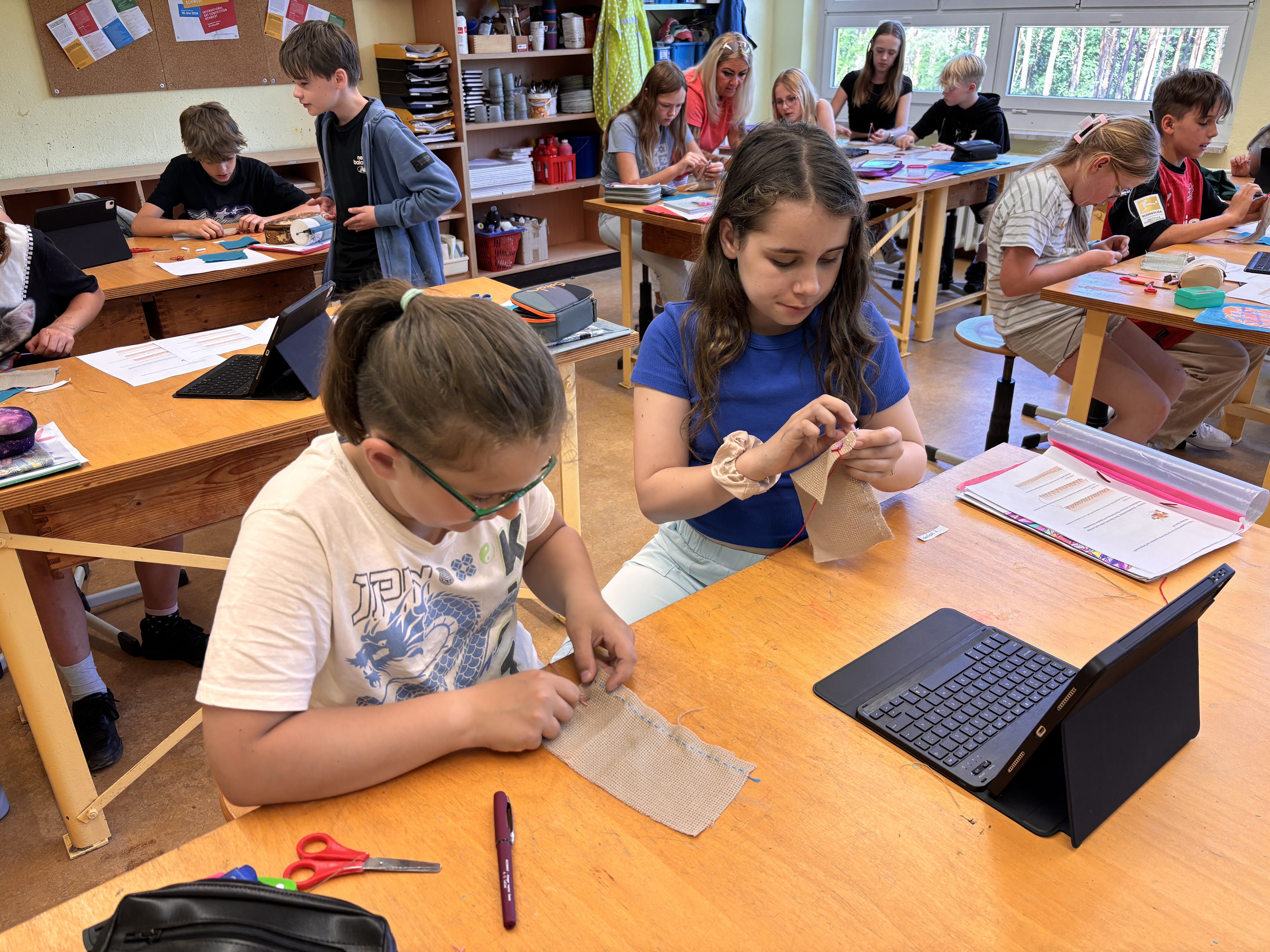 In der Jahrgangsstufe 4/5 beschäftigen wir uns im Kunstunterricht mit dem Thema Nadelarbeit – Sticken mit der Hand. Dabei lernen wir verschiedene Sticharten kennen und probieren sie selbst aus. Mit Nadel und Faden gestalten wir kleine Kunstwerke auf Stoff – ganz ohne Nähmaschine!