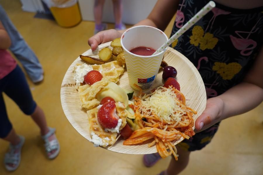Von herzhaften Corn Dogs, knusprigen Rosmarinkartoffeln und Pizza über mediterranes Gemüse, Nudeln mit Tomatensauce, „Nudelsalat mal anders“ bis hin zu Quark mit frischen Kräutern, Obstspießen und duftenden Waffeln – für jeden Geschmack war etwas dabei. Die Kinder waren mit Begeisterung bei der Sache: Es wurde geschnippelt, gerührt, gebraten, dekoriert – und natürlich auch gemeinsam probiert.
